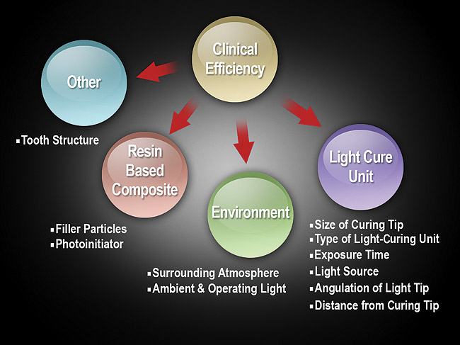 The effectiveness of a light-curing unit to cure efficiently a composite resin material depends on several factors,1,5 such as wavelength of emitted light, type of photoinitiator, bulb intensity, exposure time, distance and angulation of light tip from the composite surface, type of RBC, and shade of the resin composite. Clinical factors influencing the efficiency can be broadly divided into four categories (Figure 1):